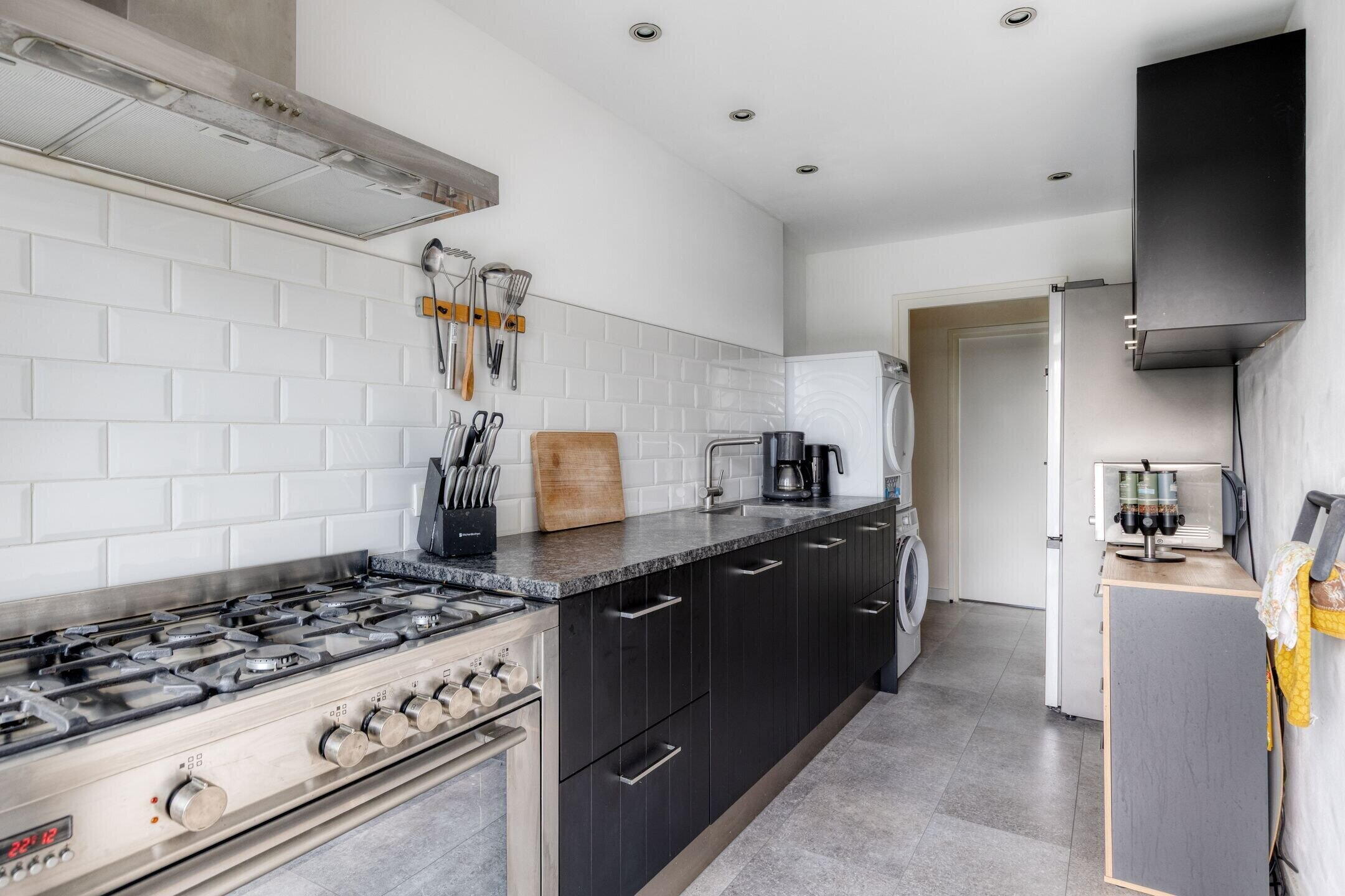 De recent vernieuwde keuken (2020) is voorzien van een vrijstaande RVS gasfornuis met 6 pitten en grote oven, vaatwasser, afzuigkap, een natuurstenen aanrechtblad met RVS gootsteen en voldoende kastruimte. De wasmachine- en drogeropstelling is tevens in de keuken gelegen. De badkamer (2021) is voorzien van een inloopdouche met regendouche en een grote wastafel.